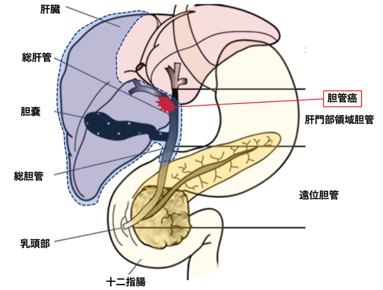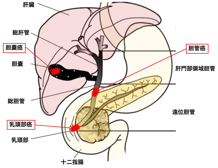 肝臓で作られた胆汁の通り道のことを胆道といいます。これには胆管、胆嚢、十二指腸乳頭部が含まれ、ここに発生した悪性腫瘍が胆道がんです。日本のがん統計では、胆道がんは年間2万人以上が新たに診断され、約17000人が死亡しております。全がん腫の部位別死亡数では男性・女性ともに8位であり、決して珍しいがんではありません1)。70歳代、80歳代の高齢者に多く、胆管がんと乳頭部がんは男性、胆のうがんは女性に多い傾向がみられます。最近では印刷業で使用される化学物質(ジクロロメタン、ジクロロプロパン)との関連が報告されています。胆道がんは、発生した部位によって胆管がん、胆嚢がん、乳頭部がんに分けることができます。